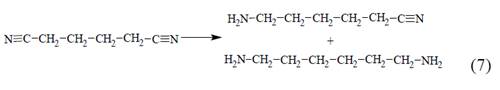 Este proceso fue desarrollado por BASF (en colaboración con DuPont) y Rhodia. El ADN se hidrogena para dar una mezcla de 6-aminocapronitrilo y hexametilendiamina (Ec.7).