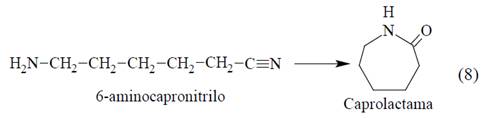 La hidrólisis catalítica consecutiva de 6-aminocapronitrilo produce 79% de CPL (Ec.8), en presencia de agua y etanol, a 70 bar y 220°C [29].