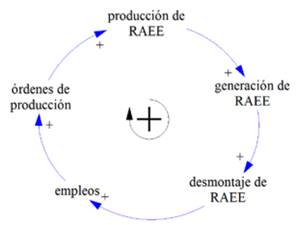 Por último, la tercera estrategia llamada fomento de empleo busca aumentar el número de empleos a partir de la prevención, reutilización, valorización y desmontaje manual, para una mejor recuperación de los componentes de RAEE. Dicha estrategia está conformada por las siguientes variables de la estructura del sistema: las ordenes de producción, producción de RAEE, generación de RAEE, desmontaje de RAEE y adicionalmente se agregó una variable denominada empleos. En este caso, no realizamos la simulación sino que el resultado de la implementación de la estrategia fue descrito a través de un bucle de realimentación (Fig. 10). El bucle obtenido fue de realimentación positiva, el cual nos mostró la influencia de una variable sobre otra y a su vez su refuerzo de forma indefinida. Específicamente, a medida que aumenta el desmontaje, este determina un aumento del empleo, que a su vez aumenta las órdenes de producción y al aumentar esta, crece la cantidad de AEE lo cual genera más RAEE y por último determina un aumento en el desmontaje, reiniciando el proceso y creando así un círculo vicioso. Este bucle muestra que el sistema no es estable porque aumenta las salidas o actividades del sistema, es decir los lleva a un límite en el que uno depende del otro para funcionar.