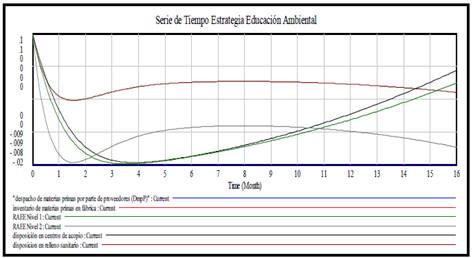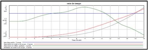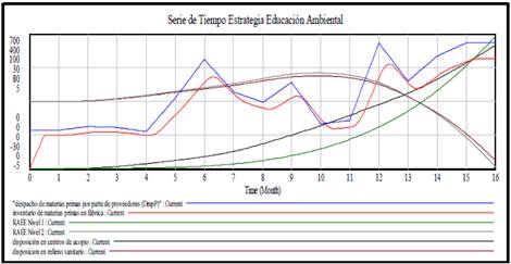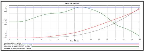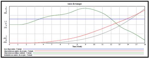 El segundo grupo de estrategias designadas como estrategias implementadas, son: responsabilidad extendida del productor [14], estímulos a la ciudadanía [15,16] y tarifa de recolección de residuos [17]. Estas estrategias han sido utilizadas en trabajos con dinámica de sistemas que tienen cierta relación con nuestra investigación y que fueron direccionadas a influenciar la tasa de disposición lo que nos permitió evaluar los objetivos dos y tres de la política. En la Fig. 11 se observa la forma cómo fueron implementadas en el Modelo, en el diagrama de niveles y flujos. Para observar el comportamiento inicial o natural del sistema socio-ambiental de RAEE, las estrategias las cuales influyen en la tasa de disposición, presentaron valores igual a cero (Fig. 12). Luego de la simulación podemos deducir como la disposición en centros de acopio y el inventario de material en centros de acopio se incrementó a medida que con el tiempo.