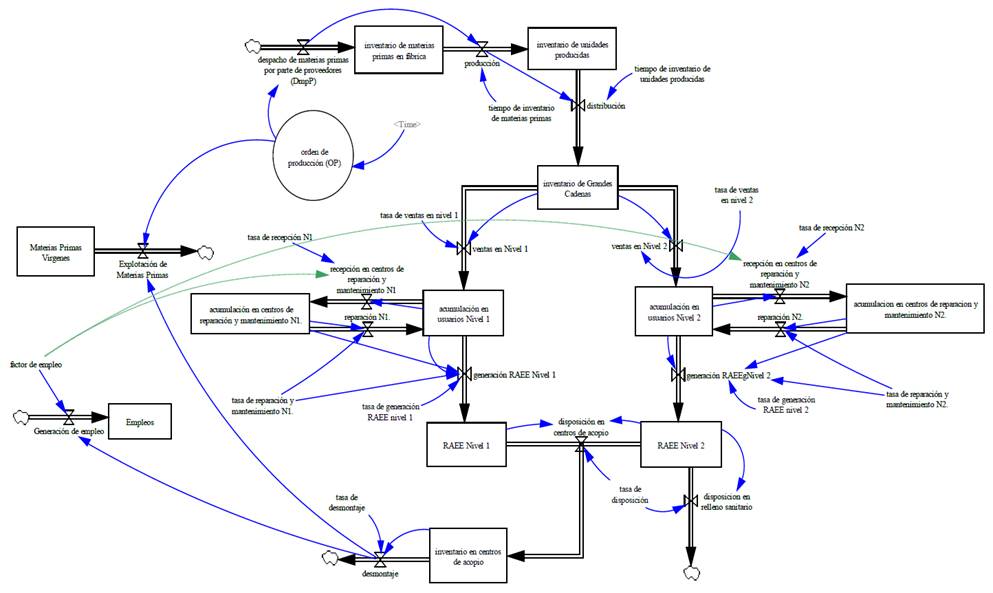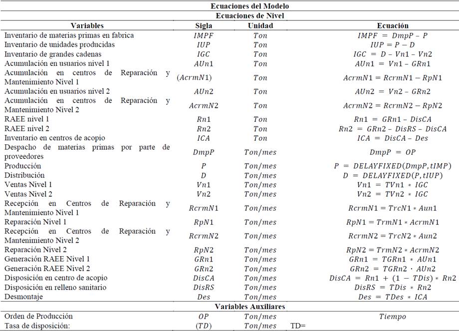 Con base en la revisión bibliográfica caracterizamos y determinamos la estructura del sistema socio-natural para los residuos de aparatos eléctricos y electrónicos (RAEE). Consecutivamente y a partir del entendimiento de dicha estructura construimos el diagrama de niveles y flujos en el que fueron vinculados el conjunto de estructuras y procesos de manera general, para la adquisición, almacenamiento y trasformación de entradas en salidas así como las reglas de decisión que rigen los flujos para el sistema de RAEE, vea Fig. 3. Concretamente el diagrama está constituido por 10 variables de estado (niveles), 14 variables de flujo y 2 variables auxiliares las cuales se describen junto con las ecuaciones del modelo en las Tablas 1 y 2.