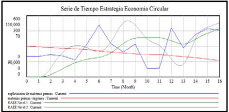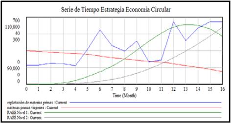 Para el desarrollo de esta estrategia implementamos en el modelo, la variable de estado denominada materias primas vírgenes y su explotación para la elaboración de los Aparatos Eléctricos y Electrónicos (Fig. 4).