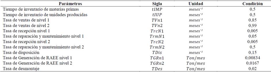 Para la simulación del modelo desarrollado, utilizamos el software libre Vensim Ple. El período de simulación del modelo fue de 30 días, teniendo en cuenta que la producción de RAEE es diaria. El método de integración numérica utilizado para la generación de las trayectorias del sistema fue el método Runge-Kutta 4 automático.
