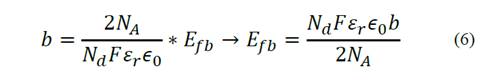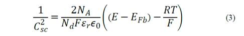 Para determinar las propiedades semiconductoras: densidad de donadores Nd y potencial de banda plana Efb de los recubrimientos se utilizó la técnica Mott-Schottky [44,45]. Esta técnica tiene como modelo, el mostrado en las ec. (3) y (4).