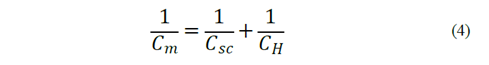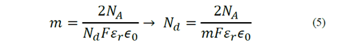 Donde CSC es la capacitancia en la región de espacios de carga, NA el número de Avogadro 6,023×1023 1/mol, Nd es la densidad de donadores, F es la constante de Faraday 9.65×104C/mol, εr es la constante dieléctrica relativa que para el caso del óxido de magnesio es de 9.86 [46,47], ϵ0= 8.8542×10-12F/m es la permitividad en el vacío, E es el potencial aplicado en la prueba , EFb es el potencial de banda plana , R es la constante de los gases 8.314J/mol*K y T la temperatura absoluta (301K). Cm es la capacitancia obtenida de las gráficas de Mott Schottky, la cual es la suma de la capacitancia del espacio de carga CSC y la capacitancia de la doble capa electroquímica CH asumida como un valor constante de 20µF/cm2 [57].
