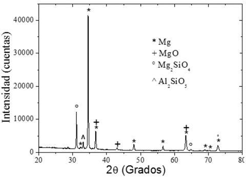La identificación química y las fases cristalinas de los compuestos formados sobre la aleación AZ31 durante el tratamiento con PEO, fueron obtenidas mediante Difracción de Rayos X en un equipo PANalytical X´PERT PRO MPD con una radiación Kα de cobre, usando un voltaje de aceleración de 45 kV y una corriente sobre el filamento de 40 mA. La adquisición de los espectros se realizó por escaneo en 2θ entre 20° y 80° con un paso de 0.001° y una velocidad de barrido 1°/min. El análisis de las bandas de difracción para determinar las fases presentes en el espectro se realizó con ayuda del software H’XPert HighScore versión 2.1b.