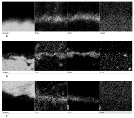 En la Fig. 2.a, b, y c, se muestra la distribución de los elementos en un mapa obtenido sobre una sección transversal de las muestras recubiertas por PEO para la condiciones de 2, 4 y 6g/L de Na2SiO3 respectivamente. Tanto en las imágenes de electrones retrodispersos como secundarios, el elemento magnesio se presenta con un mayor contraste (blanco) en la parte inferior de la imagen, lo cual corresponde al elemento del sustrato. Igualmente, el contraste (blanco) de la imagen en la Fig. 2a, 2b y 2c, corresponde a los elementos de oxígeno y silicio asociados a la presencia de estos elementos en el recubrimiento. Adicionalmente en el mapa del aluminio, la variación del contraste no fue tan significativa como para los otros elementos mencionados. Es importante notar que en la interface sustrato/recubrimiento se presentó una difusión de iones de magnesio desde la aleación hacia el recubrimiento evidenciándose en la Fig. 3 como un cambio en el contraste de dicha localidad.