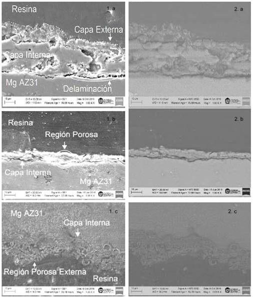 Las imágenes del corte transversal de los recubrimientos obtenidas por MEB se muestran en la Fig. 3. En estas imágenes se observa un recubrimiento con un estrato interno compacto adyacente al sustrato de Mg AZ31 y un estrato externo con micro fisuras y micro canales interconectados, los cuales son formados generalmente por las descargas o chispas características del PEO [43]. Estos dos estratos, coinciden con la estructura típica reportada para los recubrimientos de óxido de magnesio obtenidos por PEO [44]. Los espesores obtenidos se dieron entre 10.05-20.91 μm, 7.351 -11.54 μm, 1.87-2.95 μm para la muestras de 2g/L, 4g/L, 6g/L de Na2SiO3, respectivamente. Los elementos presentes en los recubrimientos y sus porcentajes en peso se muestran en la Tabla 2.