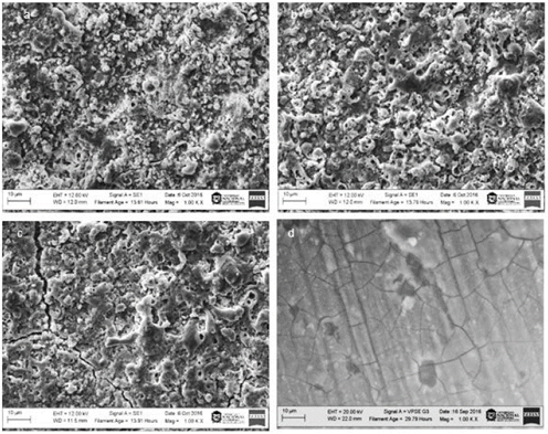 La morfología superficial de las muestras tratadas con PEO obtenida por las imágenes de electrones secundarios, se muestra en la Fig. 4. De allí se distingue la formación de estructuras porosas, común de los recubrimientos obtenidos por PEO, como consecuencia de la cavitación generada por las burbujas de gas cuando se alcanza el potencial de ruptura [39,40]. También se observa que al aumentar la concentración del compuesto que contiene Silicio (Si) en el electrolito, se incrementa las fisuras micrométricas sobre la superficie y a su vez, estas se hacen más grandes. Estas características son posibles relacionarlas con las depresiones de los arcos obtenidos en los espectros de Nyquist a partir del análisis por espectroscopia de impedancia electroquímica mostrado más adelante, específicamente, en el valor de la fase de la capacitancia, asumiendo elementos de fase constante, para representar la capacitancia no ideal entre dos interfaces paralelas, compuestas por irregularidades morfológicas que generan inhomogeneidades a la transferencia de carga.