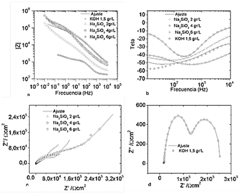 Los resultados de espectroscopia de impedancia electroquímica EIE, proveen información detallada de los procesos electroquímicos que ocurren en la interface electrolito/recubrimiento y recubrimiento/electrodo [48]. La cual está relacionada con la rugosidad de la superficie, espesor del recubrimiento y composición química. Los espectros de Nyquist y de Bode obtenidos, son mostrados en la Fig. 5 para las cuatro condiciones evaluadas. De la gráfica del Módulo de impedancia en función de la frecuencia (Fig. 5a), se observa, para las muestras recubiertas con Na2SiO3, un incremento entre 1.5 y 2 órdenes de magnitud en los valores de impedancia comparados con la muestra recubierta solo con KOH. Los valores más altos de impedancia en todo el rango de frecuencia evaluado, fueron obtenidos en las muestras recubiertas con los electrolitos de 4g/L y 6g/L de Na2SiO3.