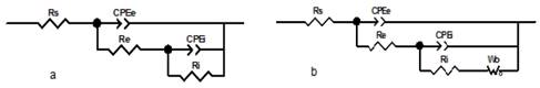 Basado en las gráficas de EIE se propuso dos circuitos eléctricos equivalentes para el ajuste de los datos obtenidos de los espectros de impedancia, es así como para la muestra tratada solo con KOH y la muestra de 2g/L, el circuito que los representa se muestra en la Fig. 6a. Para el caso de las muestras tratadas con 4 y 6g/L se ajustan a otro tipo de circuito equivalente, el cual se muestra en la Fig. 6b. Todas las capacitancias puras del circuito fueron reemplazadas por elementos de fase constante para compensar las inhomogeneidades dadas por las rugosidades, grietas o porosidades del recubrimiento.