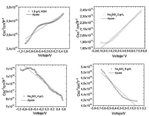 Para calcular el potencial de banda plana se hace un ajuste a una línea recta de la curva obtenida mediante M-S (capacitancia vs voltaje) mostrada en la Fig. 7. De la pendiente de la línea recta obtenida se calcula la densidad de donadores como se observa en la ec. (5) y a partir del intercepto se calcula el potencial de banda plana como se muestra en la ec. (6).
