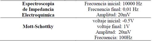 Los ensayos de espectroscopia de impedancia electroquímica y Mott Schottky se llevaron a cabo en un Potenciostato/Galvanostato del tipo Gamry instruments interface 1000 empleando una celda plana electroquímica vertical de tres electrodos en medio fisiológico simulado como electrolito, para simular condiciones fisiológicas corporales a una temperatura de 37 °C, la cual fue mantenida constante por medio de una baño termostático LAUDA E 100 conectado a la celda [41]. Durante los ensayos se empleó como electrodo de referencia, un electrodo de Ag/AgCl, como contra electrodo una barra de grafito y como electrodo de trabajo la aleación de Mg AZ31 recubierta por PEO. En la Tabla 1 se presentan los parámetros utilizados para estos ensayos.