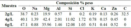 De los resultados presentados en la Tabla 2, se observa un alto contenido de oxígeno en cada una de las muestras, seguido por el contenido de magnesio y silicio respectivamente, que corresponde a la formación preferencial de óxidos de magnesio y silicatos de magnesio en los recubrimientos. La presencia de un 32.5% de carbono en la muestra de 2 g/L, se puede atribuir a que dado el tamaño pequeño de la muestra, la medición por rayos X (diámetro de interacción con la muestra de 3 a 5 μm) pudo ser afectada por los componentes de la resina, la cual está constituida principalmente de carbono, a pesar de haber tomado varias mediciones.