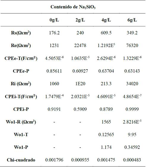 La diferencia entre los dos modelos propuestos, se basa específicamente en la presencia de una impedancia de Warburg para las muestras de 4g/L y 6 g/L de Na2SiO3, que representa la difusión de oxígeno cuya contribución se puede reflejar en la formación de hidróxidos sobre el recubrimiento, donde los defectos de la película se convierten en espacios de posible formación de silanoles (Si (OH)2).