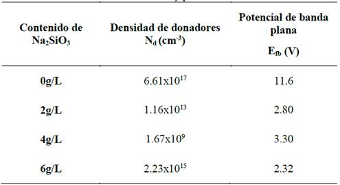 Debido a que a los donantes de un electrodo semiconductor de tipo n son principalmente vacancias de oxigeno ( 𝑉 𝑂 2+ ) y algunos intersticiales de metal (𝑀 𝑖 𝑛+ ) con cargas positivas en la interface electrodo/electrolito [58], estas vacancias hacen que el electrodo tienda a reaccionar con los aniones de la solución durante la inmersión en el fluido fisiológico simulado que contienen iones 𝐶𝑙 − , 𝐻 𝐶𝑂 3 − , 𝐻 𝑃𝑂 4 2− , 𝑆𝑂 4 2− y por ende las películas de óxido pueden ser destruidas por la penetración de estos iones que migran o difunden a través de la películas de óxido y finalmente pueden llegar a desestabilizar el recubrimiento. En investigaciones anteriores [56-58], fue reportado que un menor potencial de banda plana y una menor densidad de donadores hacen que la reactividad de la superficie con los aniones provenientes de la solución sea menor, por tal motivo las muestras con mayor densidad de donadores y adsorción de aniones muestra mayor reactividad, especialmente las especies de 𝐶𝑙 − por tener mayor movilidad. Por otro lado, la muestra con menor valor de densidad de donadores y menor adsorción de aniones durante la inmersión en solución fisiológica simulada mostró menor reactividad con los aniones [56]. De la Tabla 4 se observa que la adsorción de aniones sobre el electrodo fue disminuida para las tres condiciones de obtención del recubrimiento por PEO debido a que la densidad de donadores disminuyó con respecto a la muestra de aleación de magnesio recubierta solo con KOH. El valor más bajo de densidad de donadores lo presentó la muestra de 4g/L, lo que indica una mayor resistencia a la corrosión, coincidiendo con los resultados obtenidos por EIE. La muestra de 2g/L presento el valor más grande de densidad de donadores, lo que está en relación con los valores más pequeños de impedancia en todo el rango de frecuencia evaluado para esta muestra. Un caso aislado se dio para la muestra de 6g/L, que a pesar de tener los valores más altos de impedancia se encontró que el valor de densidad de donadores fue el más alto, lo cual puede estar relacionado con una mayor interacción del recubrimiento con los aniones de la solución, pudiéndose deber esto al exceso de oxigeno que se difunde del electrolito hasta la interface sustrato/recubrimiento. También es claro notar que el valor de impedancia warburg Wo1-R fue menor para la muestra obtenida con 6g/L, comparado con la muestra de 4g/L, indicando esto, que el paso de oxígeno a la interface no tuvo grandes restricciones. El mayor valor de potencial de banda plana fue para la muestra de 4g/L, siendo esto, relacionado con la alta resistencia del recubrimiento al paso de electrones, al contrario que para la muestra de 2g/L, la cual presento un menor valor de resistencia, de acuerdo a los resultados obtenidos en los ensayos de EIE.