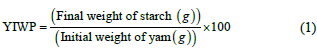 Once the starch was obtained, the yield with respect to the initial weight of the product (YIWP) was calculated, using eq. 1.
