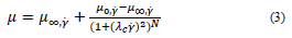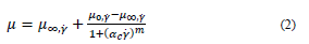 Eq. (2) describes the Cross model where, 𝜇 (cP) is viscosity, 𝛼 𝑐 (s) characteristic relaxation time, 𝛾 (s-1) shear rate, 𝑚 constant, 𝜇 ∞, 𝛾 (cP) viscosity at infinite shear rate and 𝜇 0, 𝛾 (cP) viscosity at zero shear rate.