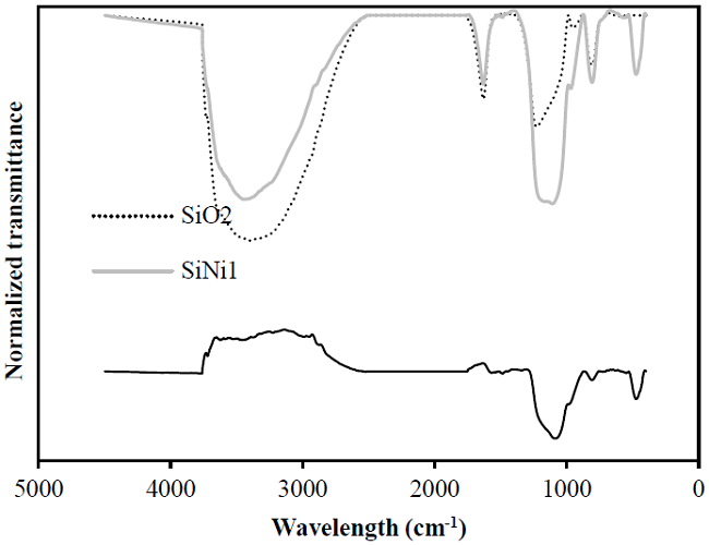 Table 1 shows the properties of the SiO2 and SiNi1 nanoparticles. It is observed that after the functionalization process, the surface area of the nanoparticles is reduced and this could be due to the blockage of some pore space in the support. The mean particle size of NiO nanoparticles over the SiO2 surface was estimated to be 1.9 nm. Fig. 1 shows the FTIR spectrum of SiO2 and SiNi1 nanoparticles, as well as the difference spectrum of both materials. The SiO2 FTIR spectrum shows silica bands assigned to different vibrations in the solid structure. Silanol (Si-OH) groups are observed in the band located at 3780-2470 cm-1 along with an overlapping O-H bond, corresponding to the water molecules [55]. Moreover, a band centered at 1630 cm-1 could correspond to deformation vibrations created by adsorbed water molecules, while the band between 1000 and 1300 cm-1 shows the Si-O covalent bond vibrations. Furthermore, siloxane (O-Si-O) symmetric vibrations appear at about 808 cm-1 [56]. The SiNi1 nanoparticles FTIR spectrum shows significant changes due to the calcination process during SiO2 functionalization. An increase in siloxane groups is observed, this is due to oxidation caused by calcination, as well as a decrease in silanol groups and water adsorbed, generated by the same process [57]. In addition, the increase in the absorption band near 430 cm-1 confirms the presence of NiO nanoparticles in the system as this is related to Ni-O bond vibration [58, 59]. Furthermore, when looking at the difference spectrum, it can be observed that the main bands related to the SiO2 support are subtracted and that bands corresponding to the NiO are exposed.