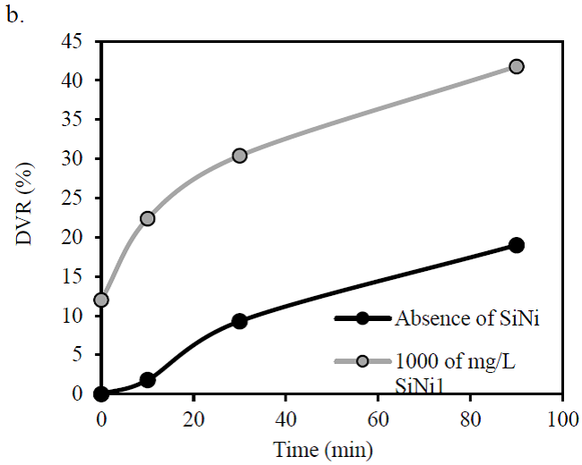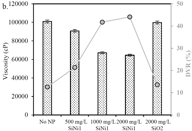 An exposure time of 90 min was selected for evaluating the effect of the SiO2 support and the effect of the nanoparticle concentration. Furthermore, SiNi1 nanoparticle concentrations of 500 and 2000 mg/L were evaluated. Fig. 3 shows the degree of viscosity reduction for a) no ultrasound treatment, b) ultrasound exposure evaluating the effect of nanoparticle dosage and SiO2 support on the HO viscosity reduction. It can be observed in Fig. 3a that a higher viscosity reduction is obtained for the samples that include nanoparticles. These results can be explained due to the adsorption of asphaltenes, a process which disrupts the asphaltene viscoelastic network favoring HO flow capacity [13]. Additionally, it is observed that the higher DVR (20%) was obtained from a 1000 mg/L dosage of SiNi1 nanoparticles. However, when comparing dosages of 1000 and 2000 mg/L in Fig. 3b, the viscosity reduction is 2% higher for the highest dosage, indicating that a concentration of 1000 mg/L could be enough. It is observed that the role of SiO2 role in viscosity reduction is lower than that of the SiNi1 nanoparticles and this is mainly due to the fact that adsorptive capacity and catalytic activity are better in the functionalized material [60].