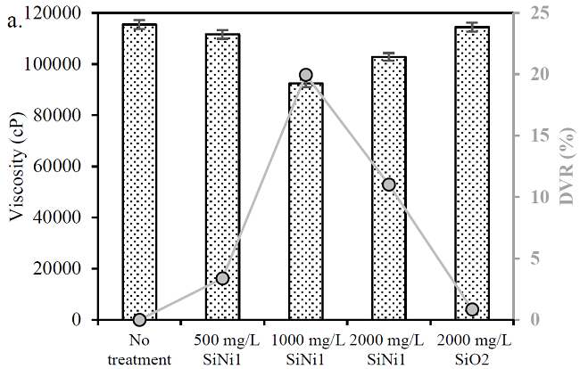 Ultrasound cavitation exposure time was evaluated for 0, 10, 30, and 90 minutes to identify the time range in which DVR is higher. It is worth mentioning that HO without nanoparticles was stirred by hand for 15 minutes, as was the HO with different nanoparticles added. Panels a and b from Fig. 2 show the a) viscosity and b) degree of viscosity reduction for HO before and after the cavitation process with a fixed concentration of 1000 mg/L of SiNi1 nanoparticles for different exposure times. Fig. 2 shows that the viscosity of the sample decreases as the exposure time increases, and this could be due to that fact that as time increases, a higher number of bubbles would be involved in the cavitation process. For the sample that includes SiNi1 nanoparticles, a DVR of 12% is observed when only the nanomaterial is added. This DVR is similar to that of the sample without nanoparticles with an exposure time of between 30 and 90 min. The highest reduction in viscosity (42%) was obtained for the system with nanoparticles and 90 min of exposure time. All experiments were performed in triplicate and the uncertainties are presented as error bars with values < 2%.