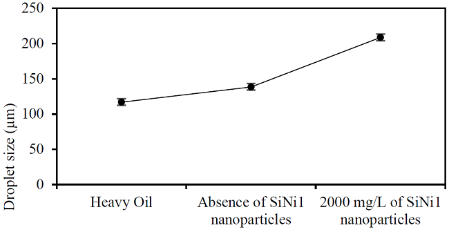 Figure 4 shows the mean droplet size of emulsified heavy oil before and after the cavitation process during 90 minutes with and without 1000 mg/L of SiNi1 nanoparticles. When only the ultrasound cavitation treatment is applied the effect on droplets coalescense is minimal, which minimizes the effect of viscosity reduction from either the demulsifying process or the hydrogenation of free radicals obtained by cracking reactions. However, with the addition of nanoparticles to the system, an appreciable droplets calescence effect was obtained which can be identified by the increase in the size of the droplets, allowing the dissociated hydrogen to freely interact with the HO and futher generating termination reactions with the free radicals obtained from the asphaltenes [36]. Mean droplet size measurements also showed almost negligible errors of less than 5%.