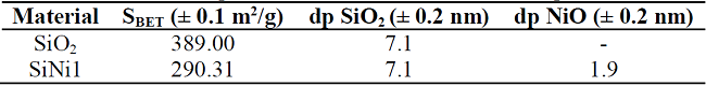 NiO nanoparticles were synthesized in a 1 wt% dosage over 7 nm SiO2 nanoparticles using the incipient wetness technique [47]. First, SiO2 nanoparticles were dried for 2 hours at 120°C. A determined amount of the SiO2 was placed in a thin layer on the bottom of a flat flask into which an aqueous solution of Ni(NO3)2 was dripped slowly to guarantee homogeneous impregnation. Finally, the material was dried at 120°C for 6 hours, and further calcined at 450°C for 6 hours to obtain the metal oxide nanoparticles [40]. The hybrid material in this study is named SiNi1, using the initials of the support substance, the symbol of the cation of the resulting metal oxide, and its weight percentage [40].