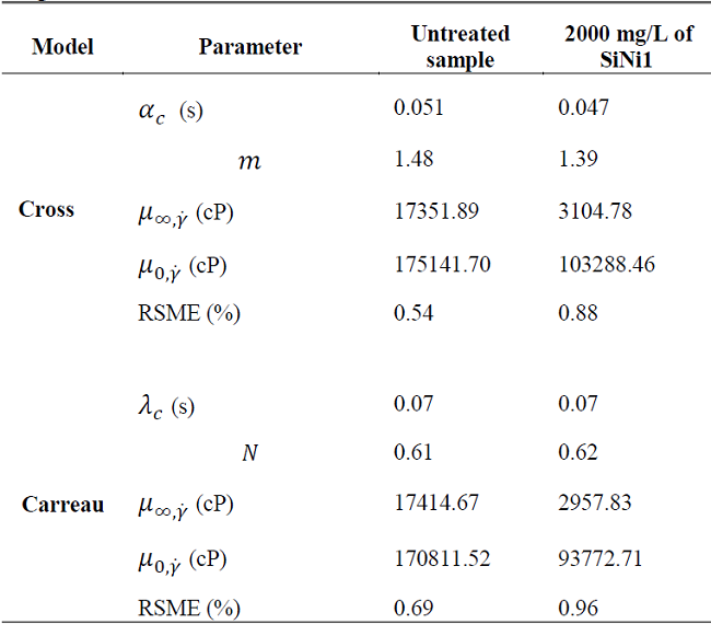 The rheological model illustrates that the parameters have a logical tendency in which both µꝏ,γ and µ0,γ have lower values than the sample submitted to ultrasound cavitation with 2000 mg/L of SiNi1. Furthermore, a better fit was achieved using the Cross model which can be seen in the lower root-square-mean error values. A decrease in the m constant for the Cross model was observed for the treated sample, which indicates that this fluid showed a more Newtonian behavior, while the αc is similar for both samples, which indicates a similar internal structure recovery time after being subjected to disturbance.
