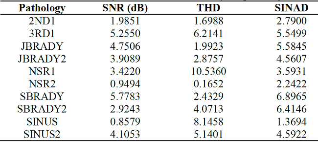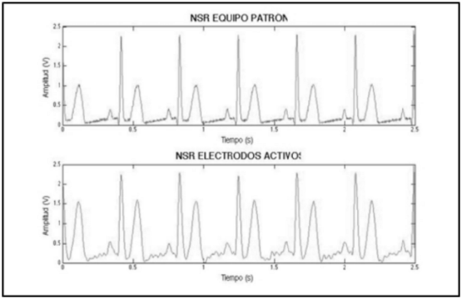 When comparing the correlation results between the signals acquired by the pattern device and the active electrodes developed, there is a correlation higher than 90%, having a peak with SINUS2 pathology with a maximum of 98.31% On the other hand, when comparing the signal-to-noise ratio (SNR), total harmonic distortion (THD) and distortion (SINAD), calculated with the mathematical expressions represented in (5), (6) and (7). These are merit figures that are determined as quality indicators for the cardiac record resulting from the proposed transducer architecture, the results are presented in Table 2.
