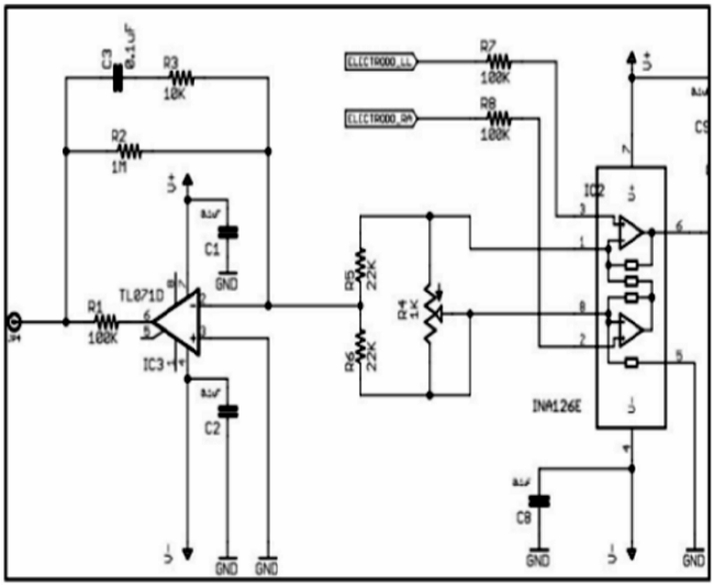 An amplifier (OPAMP) TL071, connected to the resistive arrangement which adjusts the gain of the INA126, as shown in Fig 5. The circuit mentioned allows the user to be in contact with an isolated active electrical ground and at the same time reduce common mode voltages [14].