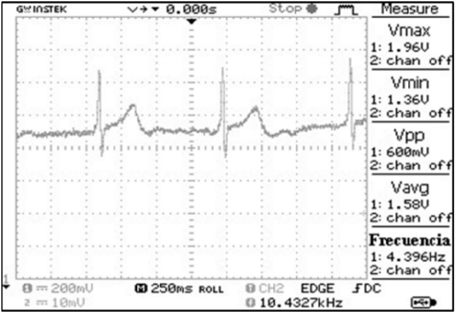 The construction of the system was divided into two phases, the first one was made with insertion elements (through hole), while the second was made with SMD surface mount elements, in turn performed functional tests in the amplification of the cardiac signal as shown in Fig. 8.