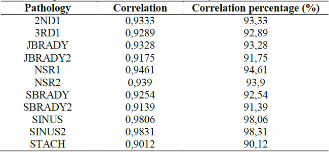 -The percentage of correlation exceeded 90% in the tests performed, this indicator is a reliable value to obtain accurate information regarding the amplitudes and frequencies of the positive and negative deflections of the electrocardiographic signal.