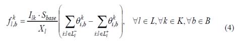 : is the power flow through transmission line l during demand block b under contingency state k. k = 0 denotes the pre-contingency or normal condition state.