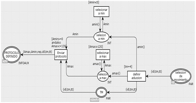 In Fig. 9, each movement shown is a substitution transition, which means that it is a new net characterizing each movement independently. Figs. 10-13 show each movement for rehabilitation; this modeling is necessary for characterizing each movement in terms of its maximum and minimum ranges and for decision-making when a protocol is poorly defined by the specialist.
