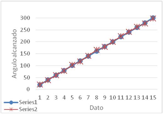Fig. 14 shows the theoretical angular position values of Series 1, represented by circles, and the experimental angular position values of Series 2, represented by asterisks. For these data, error rates are low because the maximum value is approximately 5%, which would indicate that in rehabilitation, an error between 3 and 4 degrees could occur according to what is defined by the specialist in the protocol.