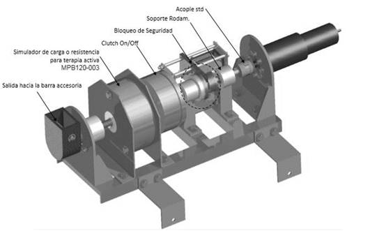 The power system consists of the following components: a motor-reducer, a clutch, and a magnetic brake. The motor- reducer is responsible for performing the movement of the patient's limb when in passive treatment, the clutch is responsible for decoupling the motor when switching from passive to active treatment, and the magnetic brake is responsible for opposing resistance to the patient at the time of active treatment. The information from both active and passive treatments is obtained through the control and communication system and is updated in each patient medical record. Fig. 2 shows the power unit for the rehabilitation assistive technology device.