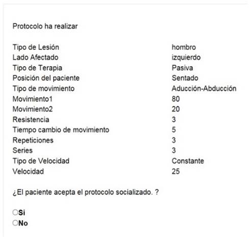 Once the protocol is received and accepted by the patient, this information is managed by the assistant and entered through the interface designated for this function.