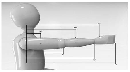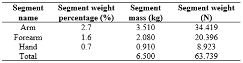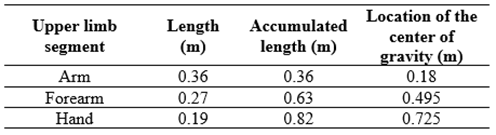 Fig. 3 shows the length of each arm segment. Table 2 shows the lengths of each upper limb segment, determining their centers of gravity.