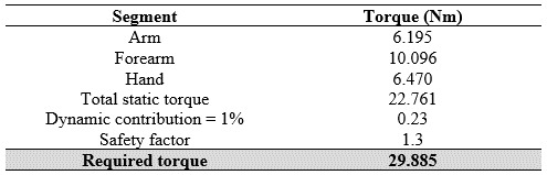 To select the final control element that will generate arm movement, it is necessary to know the torque necessary to move each segment independently. Where the total torque consists of the static and dynamic torque, the torque calculated for each segment must be added to obtain the total torque needed to move the entire upper limb. Table 3 shows the results of the static torque for each segment. The effect of the dynamic torque is only 1%. In addition, in the total torque, a safety factor of 1.3 was considered to ensure anomalous system operating conditions (undue manipulation of the assistive technology device) and any possible damage.