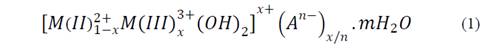 Clays are interesting materials which have been extensively used for a number of industrial applications, for example, they are applicable in the preparation of nanocomposites [1], controlled-release pharmaceutical systems [2,3], catalytic supports [4,5], and other purposes. A category of clays, layered double hydroxides (LDH), are useful materials because it is possible to modulate several of their physical-chemical properties by proper modification of the preparation method and their chemical composition [6-10]. LDH consist of positively charged layers of metallic hydroxides containing water molecules and anions in the interlayer spaces that compensate the charge of the laminae. The positive charge on the layers comes from the substitution of divalent cations by trivalent ones on some octahedral positions, giving rise to structures that are represented according to equation (1):