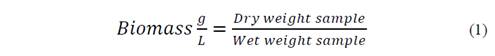 The quantification of the microorganism growth was carried out by three methods which were correlated through a linear equation and statistical analysis. (1) Cell growth was measured spectrophotometrically based on the optical density at 600 in a Spectronic® spectrophotometer 3w2R179001 genesys 2PC. (2) The UFC/ml was performed using the microdrop technique, plated on to the surface of an agar plate 10μL in duplicate of the last 4 serial dilutions. The cultures were incubated for 48 hours at the established temperature conditions (Table 1), after incubation, counting colony was made. To precise the results it was considered, the average number of the grown colonies in the dilution per 100 (correction factor adjusting to 1ml) and multiplied by the inverse of the dilution. (3) The dry weight was measured to 5mL of harvesting liquid culture by membrane filtration (filters 0.2 μm x 47mm ADVANTE Brand) previously weighed in the analytical balance Adventurer AR2140 or AV-210 Ohaus Corporation, using Thomas lab vacuum pump, the filters were placed in a Binder ED53 01-27082 incubator a 70°C for 24h hours. After this time, the filters were weighed, and the biomass were calculated using eq. 1.