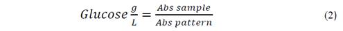 The glucose concentration was determined by the Glucose GO-PAD enzymatic method of Sigma Aldrich, using 10μL of the filtered culture plus 1mL of the reagent, dilutions were prepared for samples that presented OD > 1. The samples were mixed and incubated for 10 minutes at 22°C± 2°C. After this time, the reading of the samples and the standard (1g / L) was performed against the reagent blank. The glucose concentration was calculated using eq. 2