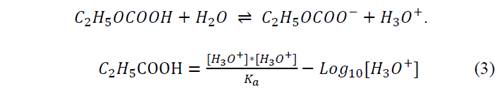 The pH was measured in real time using a device manufactured by the Interfaculty Instrumentation Center of the University of Antioquia. The electrode was maintained for 24 hours in contact with inoculated liquid culture. The acidity was calculated using eq. 3 which corresponds to the chemical reaction of the acid (lactic acid) dissociation, taken into account the change in the pH value during the fermentation time, the pH which is equal to-log [H3O+] and the acidity constant (Ka) of lactic acid that equals to 1,38 x10-4 M [11]. These calculations were expressed in mg/L of lactic acid.