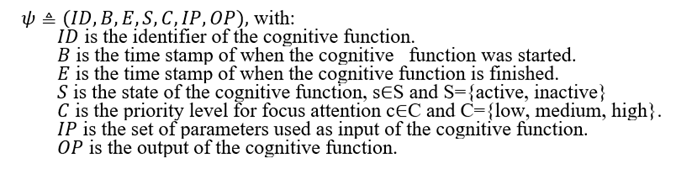 ) is executed at the object level with an input (IP), output (OP) and start time (B), a profile is automatically generated for the cognitive function in the self-model with the fields.