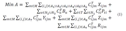 } 𝑖𝑗𝑚 𝑇 : Unitary transportation cost in the arc (𝑖,𝑗)∈𝐴 using transportation mode 𝑚∈𝑀