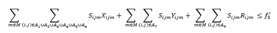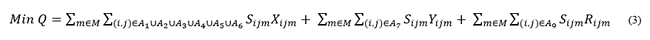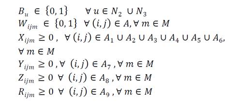 𝑋 𝑖𝑗𝑚 : Amount of product to transport in the arc (𝑖,𝑗)∈ 𝐴 1 ∪ 𝐴 2 ∪ 𝐴 3 ∪ 𝐴 4 ∪ 𝐴 5 ∪ 𝐴 6 by transportation mode 𝑚∈𝑀.