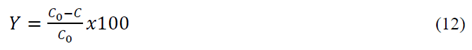Donde C0 es la concentración inicial de índigo carmín (mg/L-1) y C es la concentración de índigo después de cierto tiempo de operación.