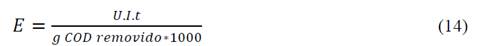Donde E es el consumo de energía eléctrica (kW-h/g de COD removido); U es el voltaje (V); I es la corriente (A); t el tiempo de operación (h).