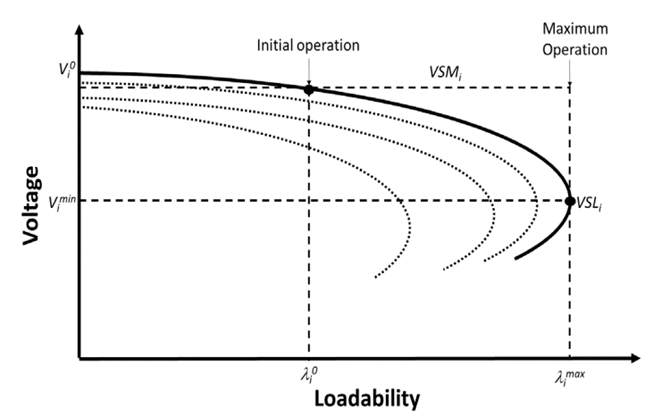 The VSLs and VSMs are found by the algorithm, representing the operating risk from the starting point to the limits as shown in Fig. 2[1]. In this figure, the parameter λimax is the maximum load at bus i, λi0 is the initial load at bus i, VSLi is the voltage stability limit at bus i, and VSMi is the voltage stability margin at bus i. As multiple VSMs can be calculated by measuring the distances from the initial operating point to the multiple maximum VSLs, the critical margin and limit are selected from the minimum distance obtained in the simulation.