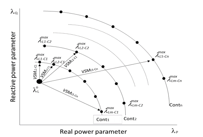 VSL and VSM can be calculated from the operating point to the maximum values represented at each VSC. The most critical VSM and VSL can be classified according to the event as the minimum magnitudes of VSM. This method is useful to classify the severity of contingencies before and after the power load or generation change in an identified direction. The algorithm creates multiple curves and evaluates the different risks that the power system can be subject to in the same iteration process.